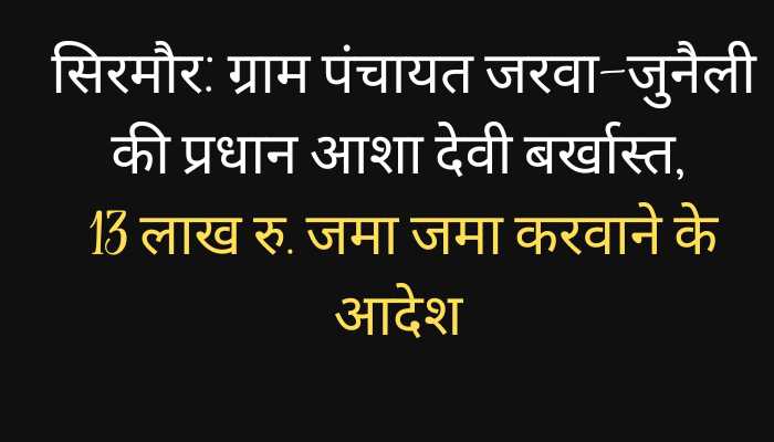 नाहन : उपायुक्त सिरमौर प्रियंका वर्मा ने विकास खण्ड शिलाई की ग्राम पंचायत जरवा-जुनैली की प्रधान आशा देवी को अपने कर्तव्यों के निर्वहन में अवचार का दोषी पाये जाने पर ग्राम पंचायत जरवा-जुनैली के प्रधान पद से तत्काल हटाने के आदेश जारी किए है। छह वर्ष की कालावधि के लिए पंचायत के पदाधिकारी के रूप मे निर्वाचित होने के लिए निर्रहित (अयोग्य) करने के भी आदेश जारी किए है।
