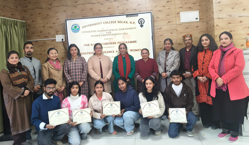 सोलन: राजकीय महाविद्यालय सोलन में शुक्रवार को महिला सुरक्षा और सशक्तिकरण को लेकर एक अहम कार्यक्रम आयोजित किया गया। कॉलेज के महिला सशक्तिकरण सेल ने महिलाओं के खिलाफ हिंसा का खात्मा विषय पर छात्रों को जागरूक किया।